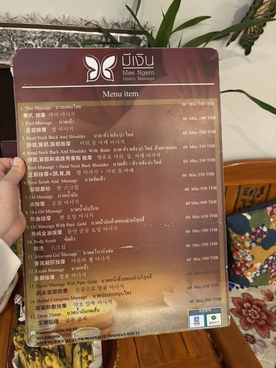 이번에 다녀온 곳은 님만해민 원님만 근처의 'Mee Ngern Health Massage' 사실 처음엔 숙소 바로 옆에 있는 ‘DN Wellness’를 가려 했는데 예약이 꽉 차 있어서 급하게 구글맵으로 찾은 로컬 마사지샵이었다. 하지만 이 선택이 오히려 신의 한 수 였을지도!