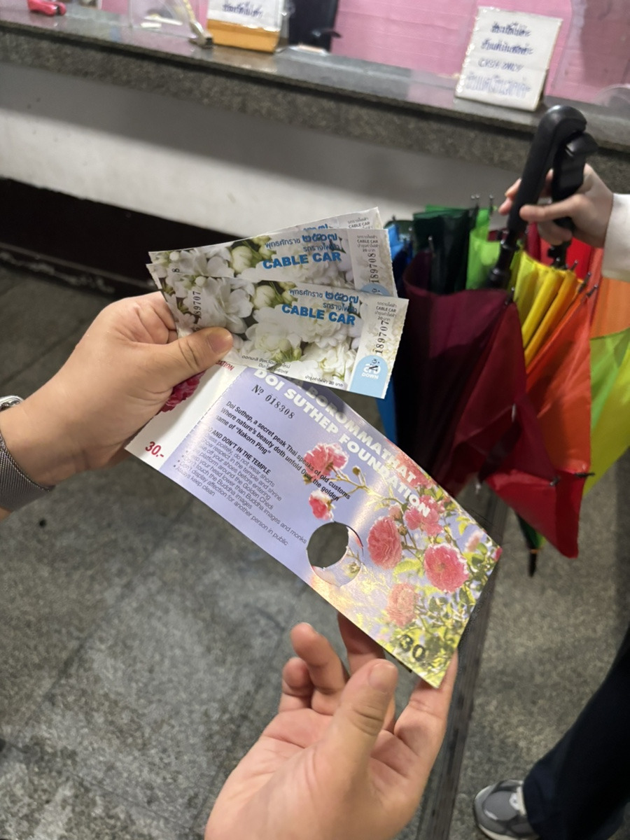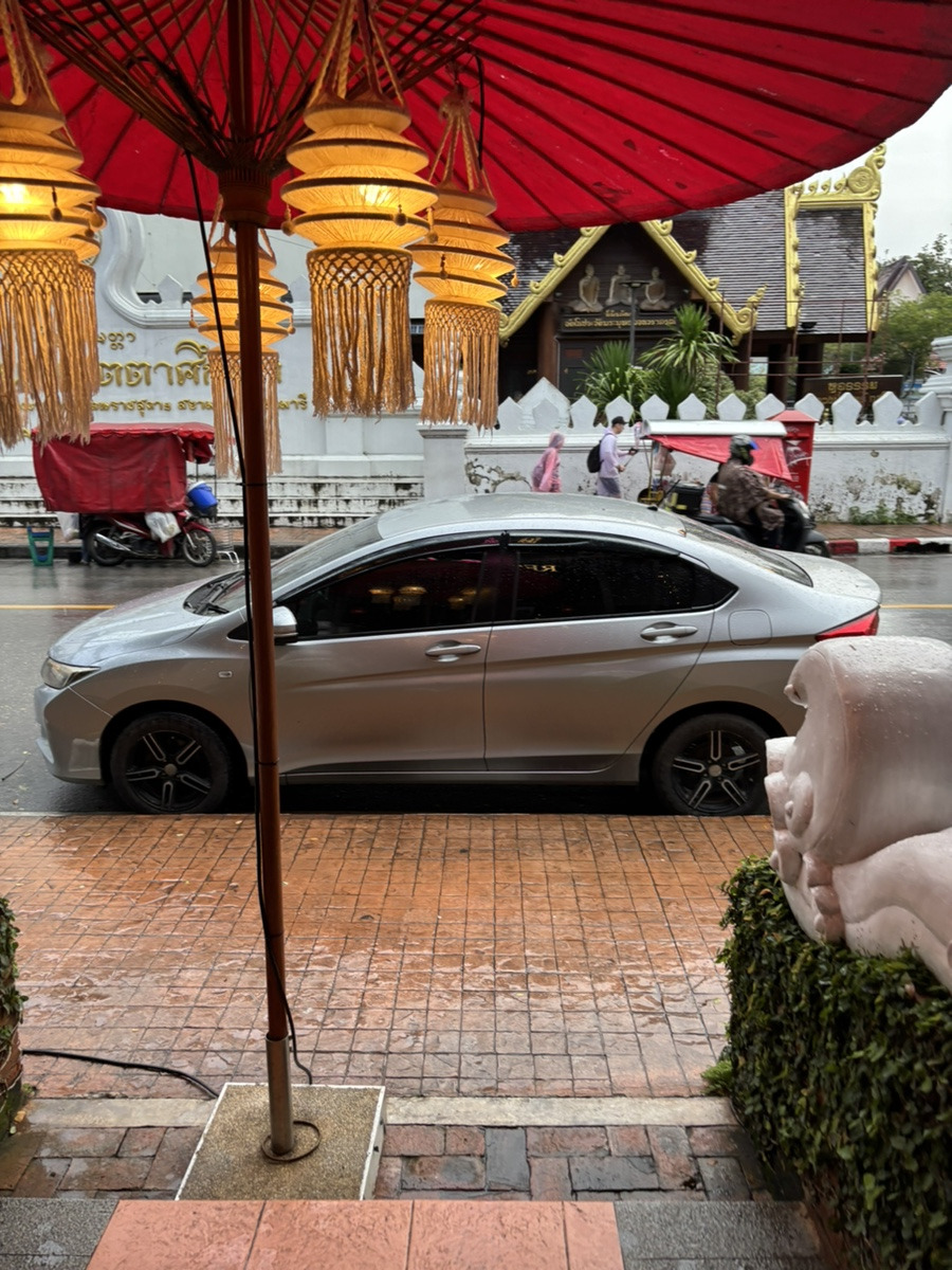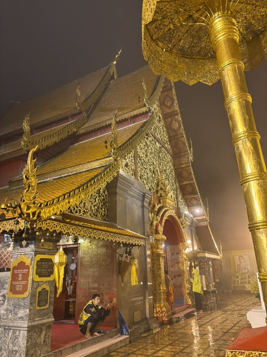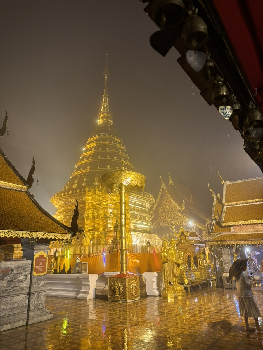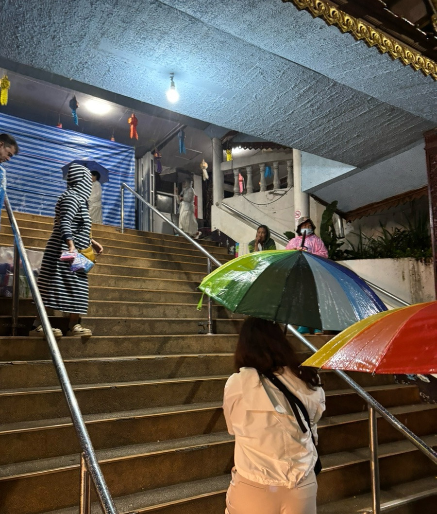비 덕분에 도이수텝 사원의 분위기가 더 신비로웠다. 물안개, 촉촉한 공기, 맨발로 걷는 감성까지 더해져 오히려 잊지 못할 경험이 되었음.