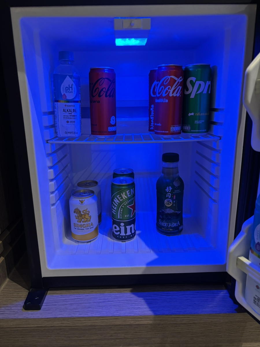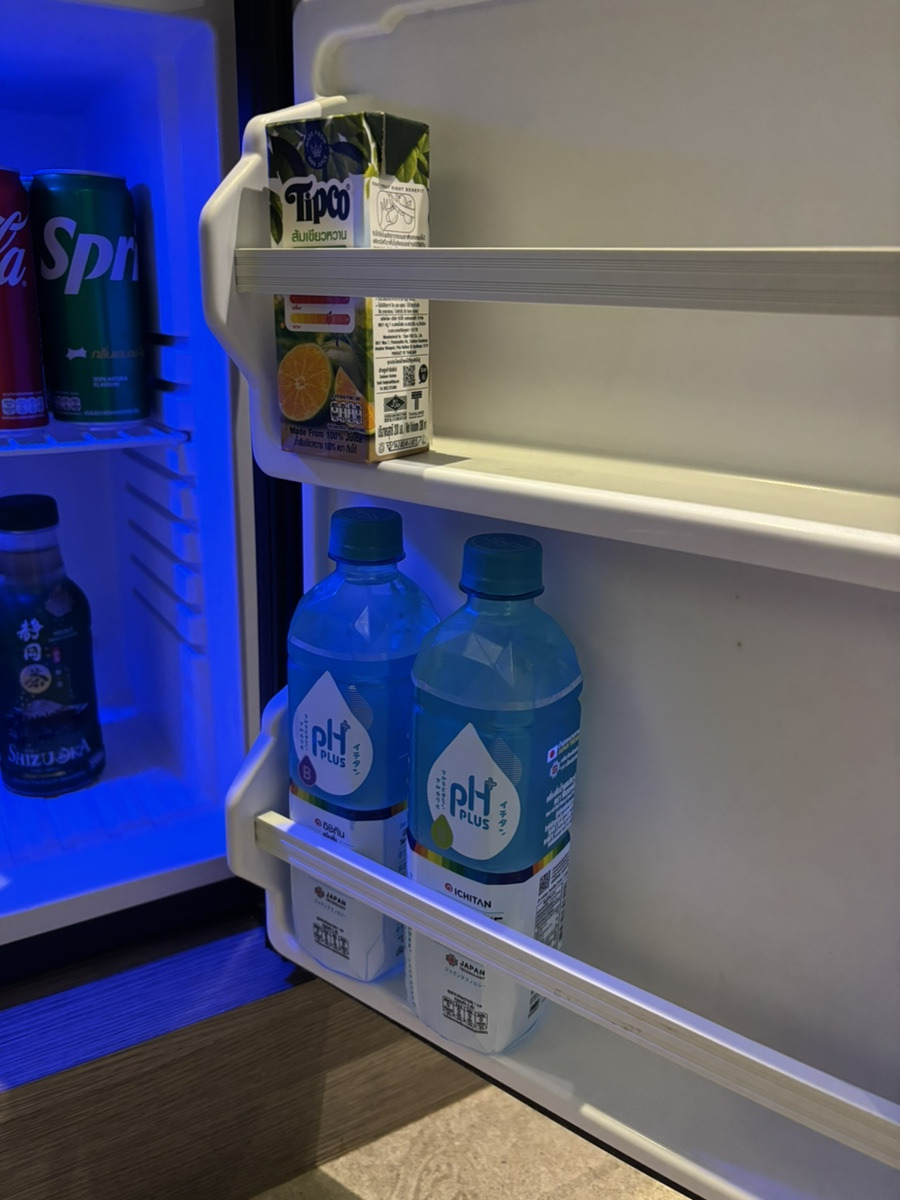 냉장고에는 무료 제공 음료가 1인 1병씩 (맥주 포함) 준비되어 있었고, 웰컴 스낵으로는 태국 전통 강정 같은 쌀과자 간식이 제공되었다. 작지만 센스 있는 환영 서비스였다.