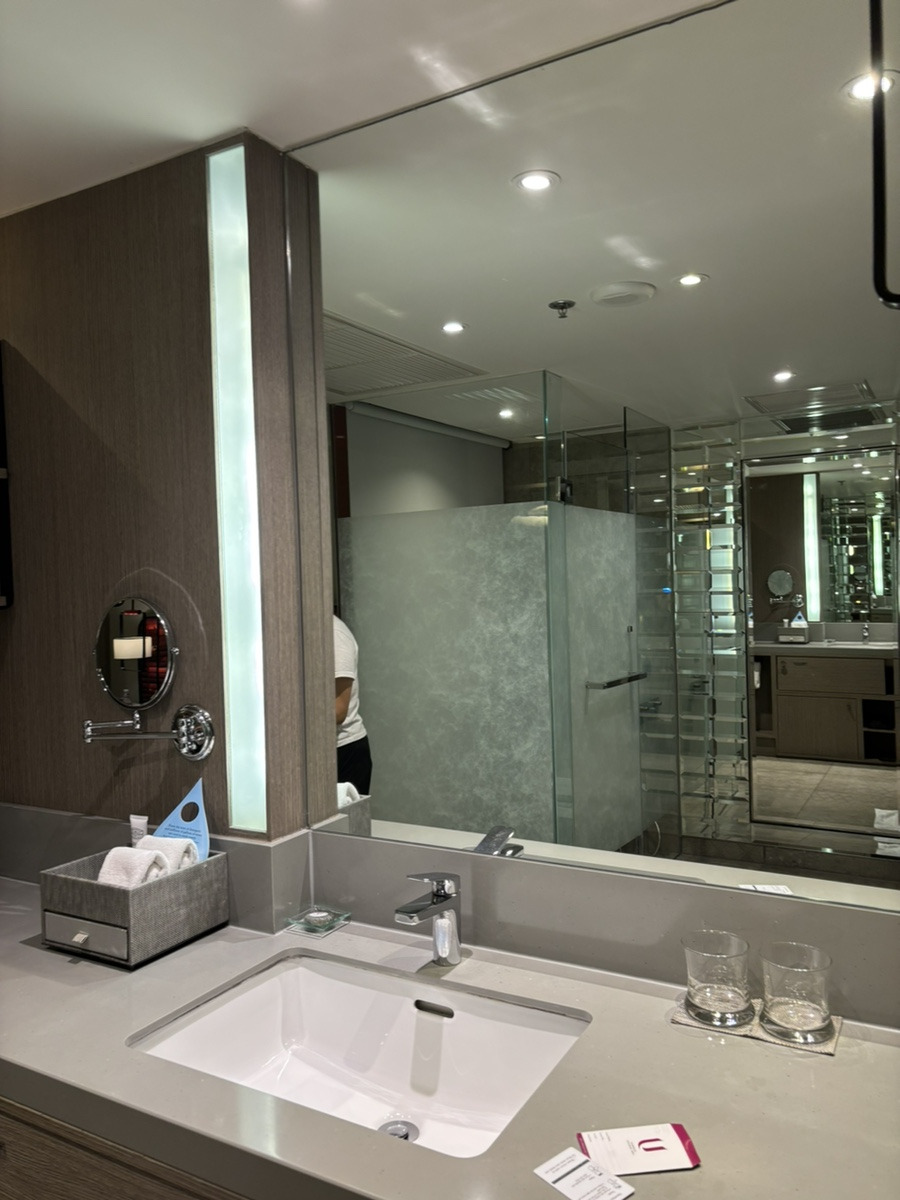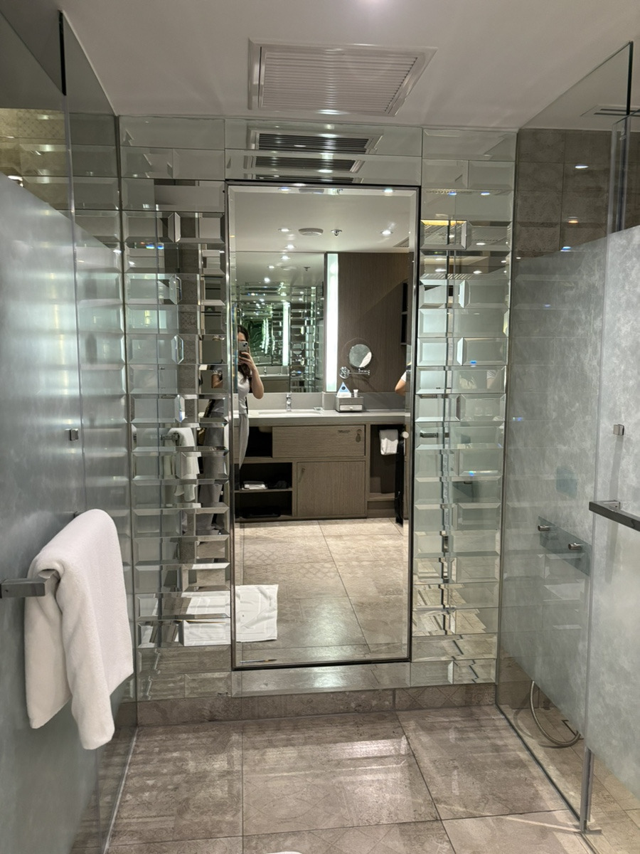 욕실은 샤워부스와 화장실이 분리되어 있고, 세면대는 바깥에 따로 설치되어 있는 구조. 어메니티는 기본적인 로션 외에는 제공되지 않아 칫솔, 치약은 개인 지참이 필요했다.