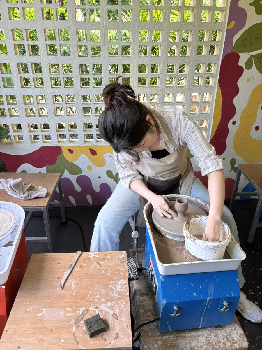 선생님께서 먼저 시범을 보여주신 뒤, 각자 앞치마를 입고 본격적으로 물레를 돌리기 시작했다. 처음엔 익숙하지 않아 손이 덜덜 떨렸지만, 어느 순간부터 점점 점토가 그릇처럼 변해가면서 몰입하게 됨.