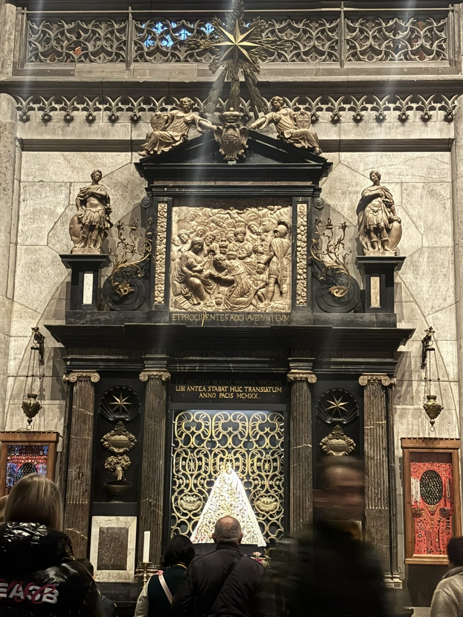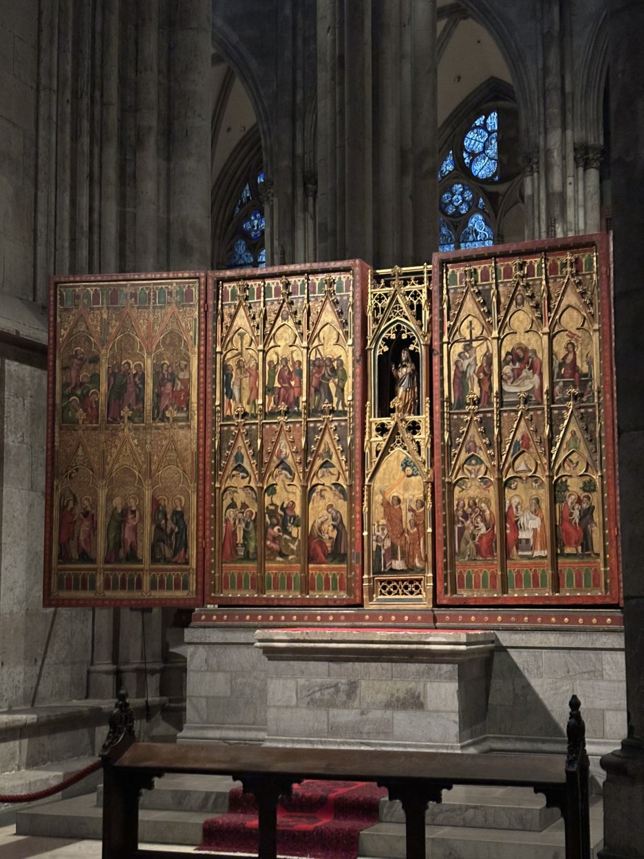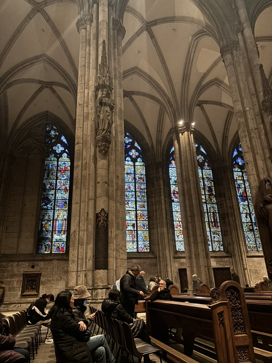 성당 외벽 조각들은 정교하고 위압적일 정도로 웅장했고, 내부로 들어가면 조용한 미사 공간, 스테인드글라스, 기도 촛불 등이 펼쳐진다. 쾰른 대성당의 스테인드 글라스와 웅장한 분위기는 이미 다녀온 여러 친구들이 말해줘서 알고 있었지만, 실제로 보니 압도적인 광경이었다.
