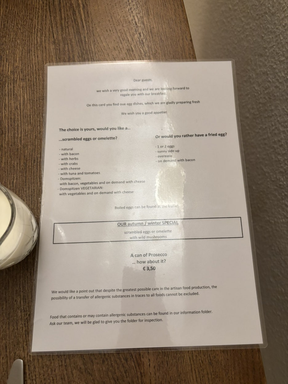 내가 다 맛보지는 못했지만 후기처럼 호텔 돔스피첸의 조식의 가지수나 퀄리티는 가격대비 아주 훌륭했다. (몸 상태가 안좋은게 너무 안타까웠을 뿐..)