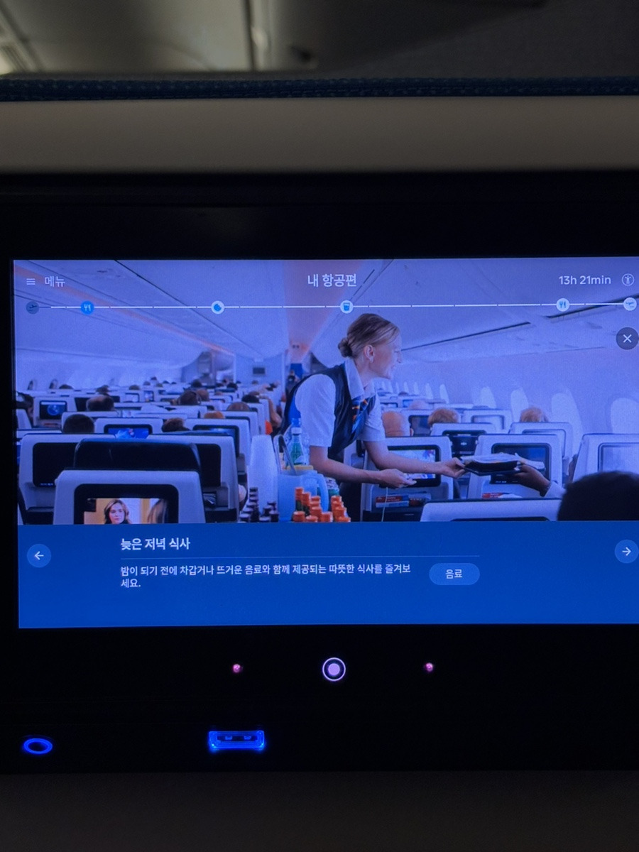 KLM 기내 엔터테인먼트 시스템은 꽤 잘 갖춰져 있었다. 30편이 넘는 최신 영화와 다양한 음악, 게임이 탑재되어 장시간 비행에서도 지루하지 않았다. 더불어 식사시간과 비행 잔여시간도 실시간으로 볼 수 있어서 승객 편의를 위해 신경쓰고 있다는걸 느낄 수 있었다.