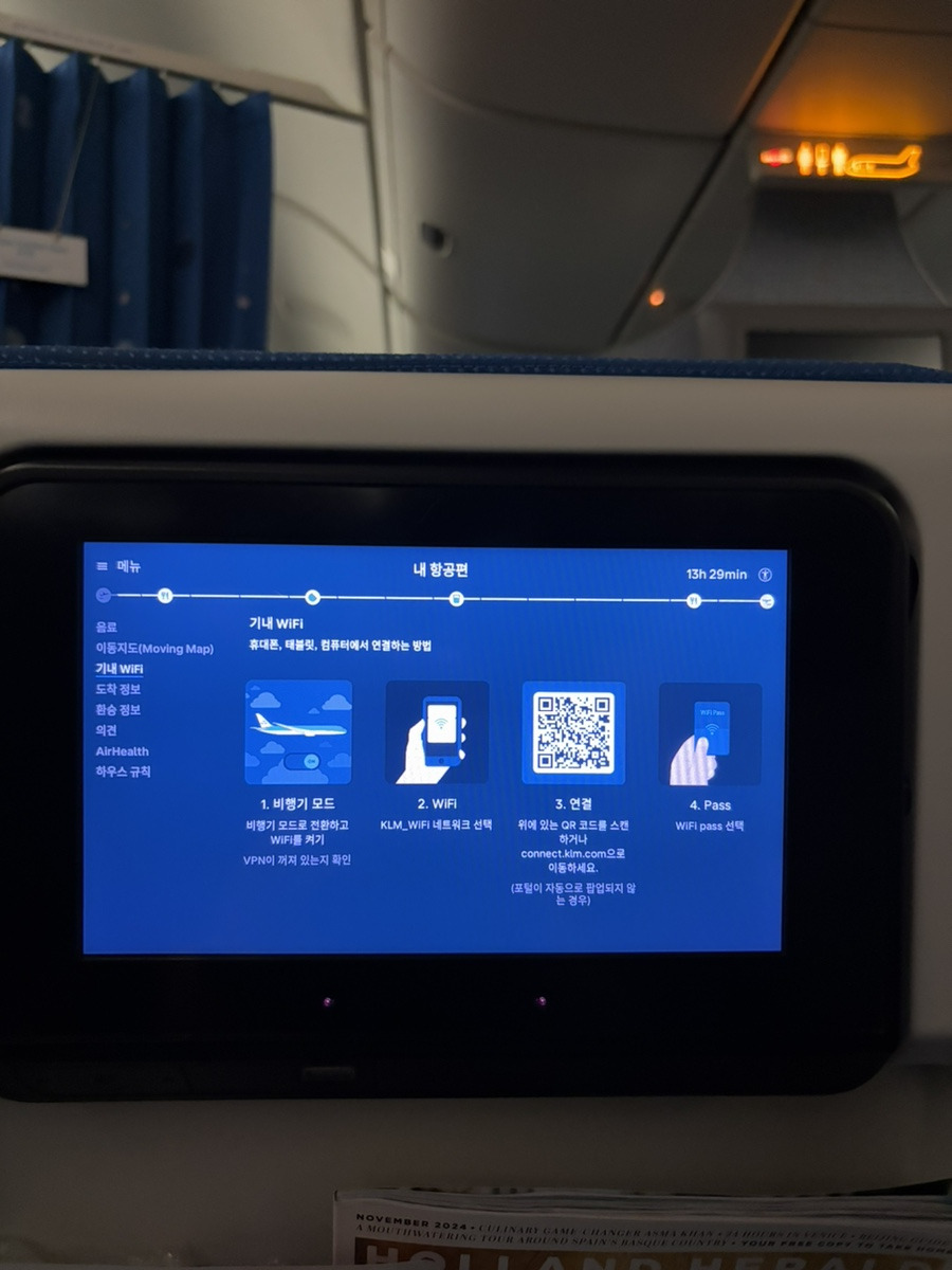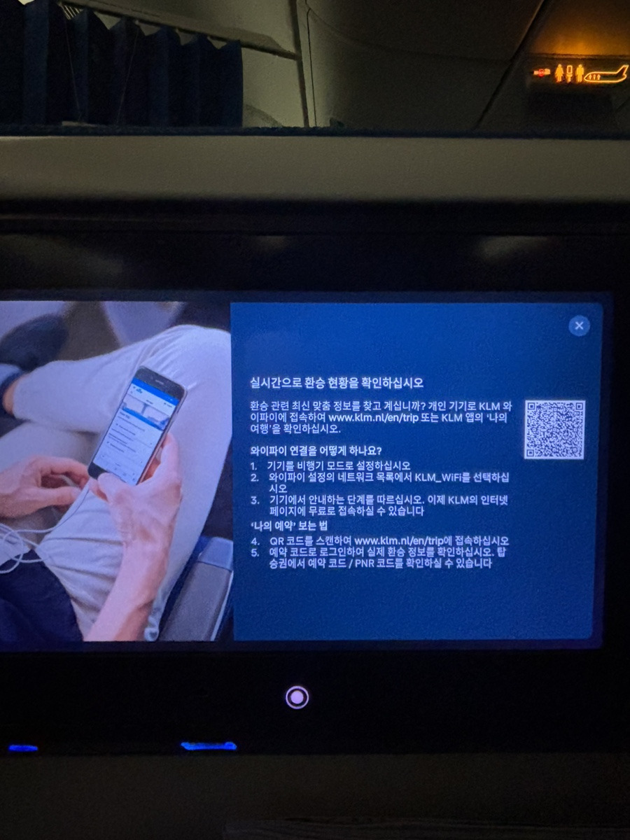 특히 만족스러웠던 점은 기내 와이파이 서비스였다. KLM은 메시지 수신이 가능한 무료 와이파이를 제공하는데, 이를 통해 실시간 도착 정보나 환승 게이트 변경을 확인할 수 있었다. 단, 메시지 발신은 불가능하며, 유료 서비스를 통해서만 가능하다.