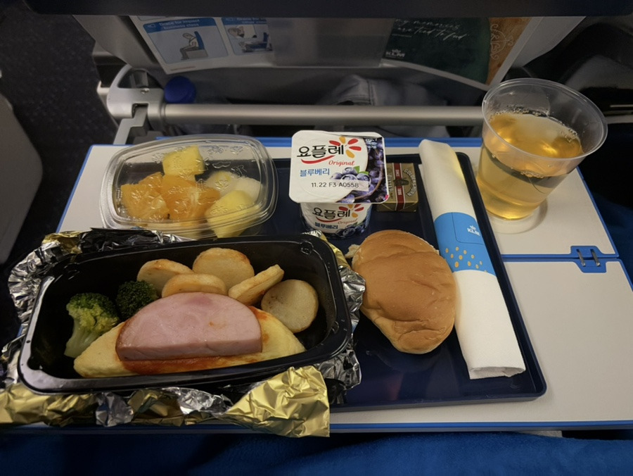 이번 KL856편의 첫 식사는 늦은 저녁 시간에 제공되었다. 메인 메뉴는 토마토 파스타로, 맛은 무난한 수준이었지만 디저트로 제공된 초콜릿 케이크는 진하고 달콤해서 인상 깊었다. 함께 제공된 와인도 부드럽고 무난하게 즐길 수 있었다.