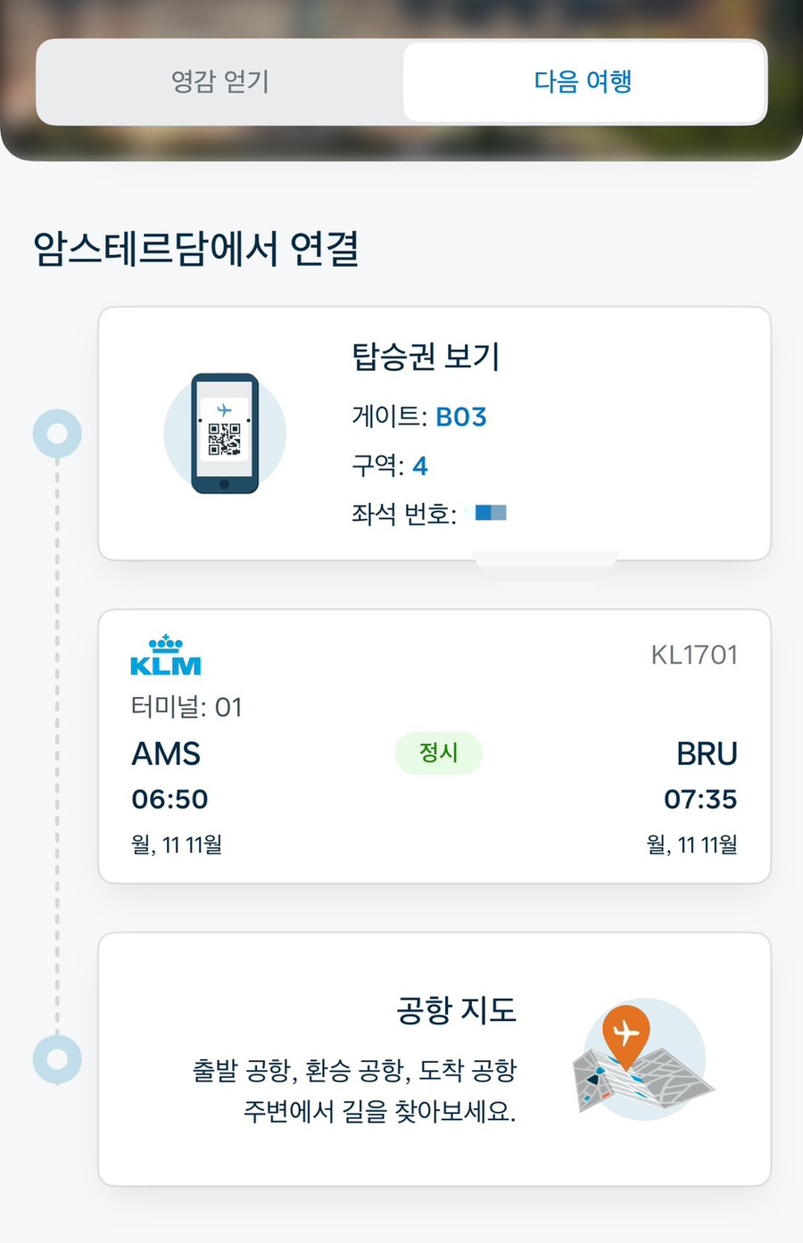 오전 4시 50분경 스키폴 공항에 도착했으며, 환승 시간도 여유 있게 확보되어 큰 무리 없이 이동할 수 있었다. KLM 어플과 기내 와이파이를 통해 미리 환승 게이트 정보를 파악할 수 있었던 점도 꽤 도움이 되었다.