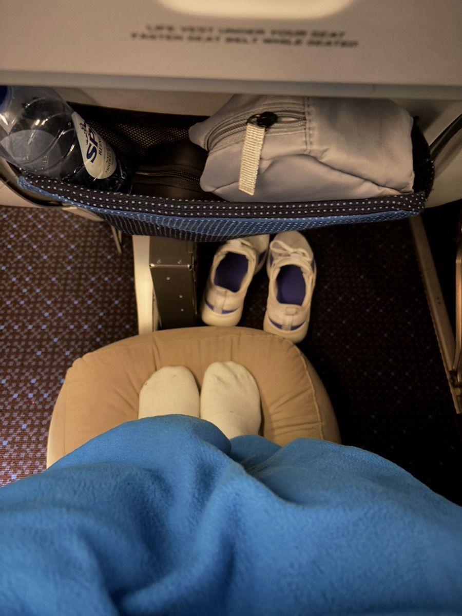 내 좌석은 17열로, 앞에는 프리미엄 컴포트 좌석이 위치해 있었으며, 다리를 뻗었을 때 공간이 충분히 남았다. 참고로 신장 158cm 기준으로 신발을 벗고 발받침을 놓아도 공간이 남았고, 170cm 중반의 옆자리 승객도 편안하게 잠들 정도였다.