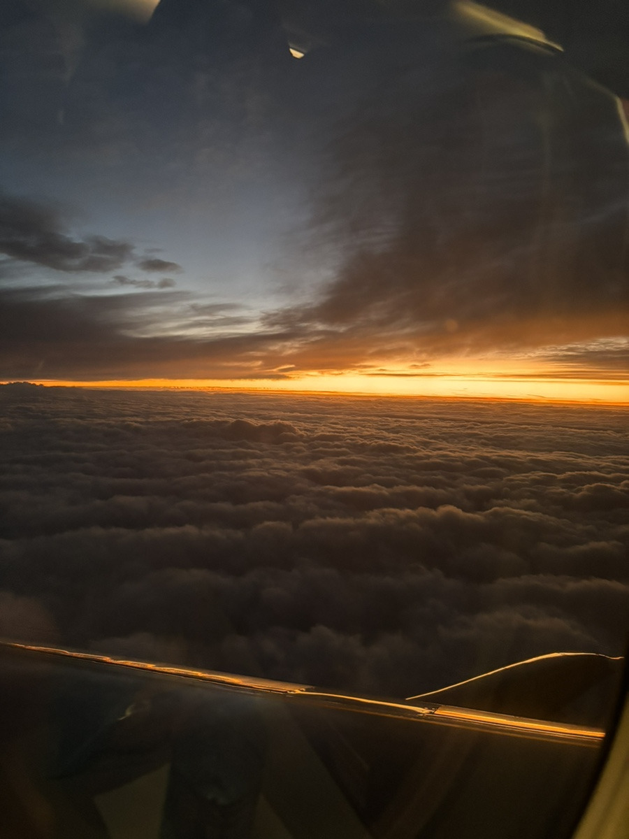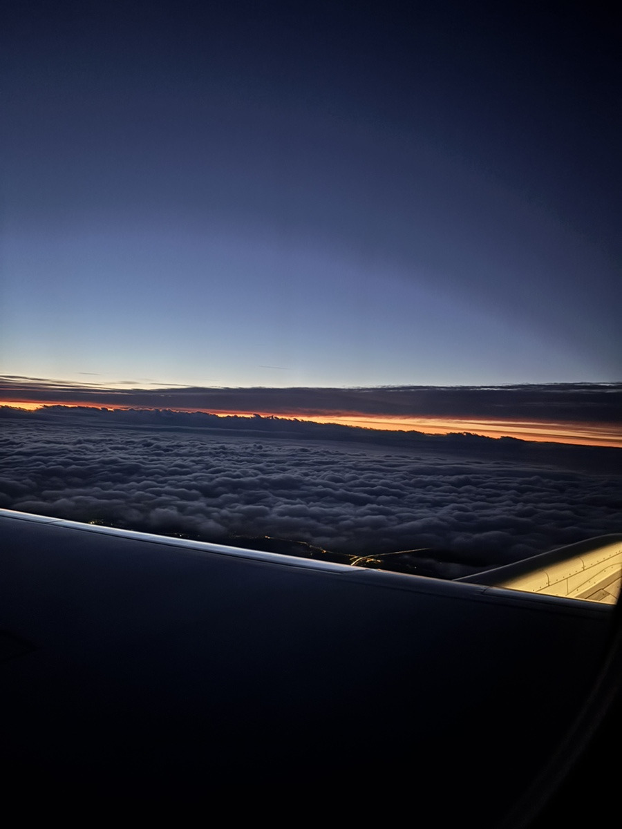 2-2 좌석 배열의 소형 항공기였지만 간단한 간식과 생수도 제공되었고, 25분의 짧은 비행 동안 일출과 함께 유럽 하늘을 감상할 수 있었다.